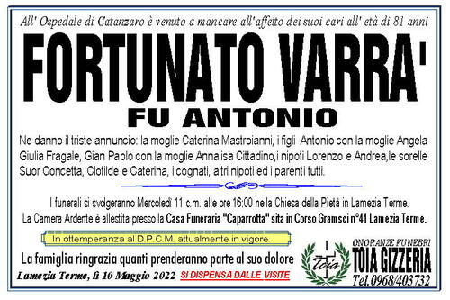 I funerali si svolgeranno Mercoledì 11 c.m. alle ore 16:00 nella Chiesa della Pietà in Lamezia Terme.