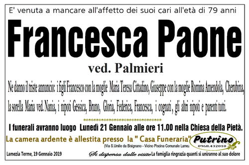 La camera ardente è allestita presso la '' Casa Funeraria'' PUTRINO
