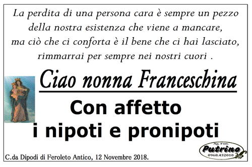 Le esequie si svolgeranno Martedì 13 Novembre alle ore 15,30 nel Santuario della Madonna di Dipodi,