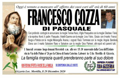 I funerali avranno luogo domani Mercoledì c.m. alle ore 15: 30 muovendo dalla Casa dell'Estinto