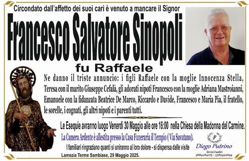 Le Esequie avranno luogo Venerdì 30 Maggio alle ore 16:00 nella Chiesa della Madonna del Carmine.