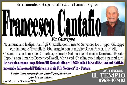 Le Esequie avranno luogo Sabato 20 Gennaio alle ore 15:30 nella Chiesa di S. Giovanni Battista,