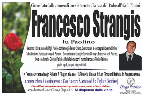 Ne danno il triste annuncio:i figli Paolino con la moglie Teresa Cimino, Gennaro con la compagna Giovanna Cimino, l’adorata nipote Francesca, i cognati Palermo : Giovannino con la moglie Teresina Stranges, Francesca ved. Palermo, Dora con il marito Giovanni Talarico, Maria Palermo con il marito Francesco Pierino Palermo,