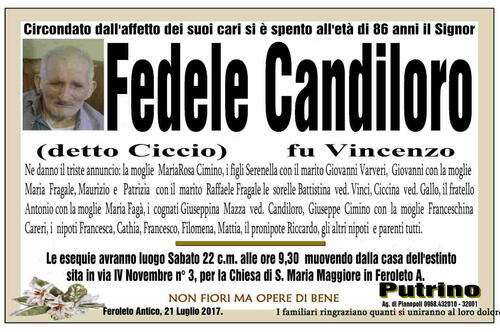 Feroleto Antico, 21 Luglio 2017. I familiari ringraziano quanti si uniranno al loro dolore