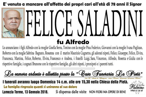 I funerali avranno luogo Domenica 14 c.m. alle ore 15,30 nella Chiesa della Pietà .