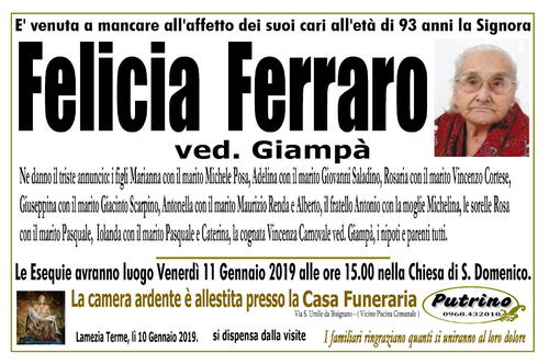 Le Esequie avranno luogo Venerdì 11 Gennaio 2019 alle ore 15.00 nella Chiesa di S. Domenico.