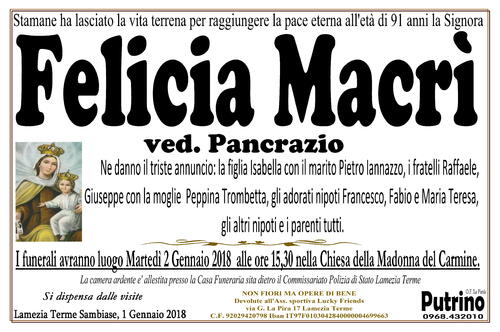 I funerali avranno luogo Martedì 2 Gennaio 2018 alle ore 15,30 nella Chiesa della Madonna del Carmine.