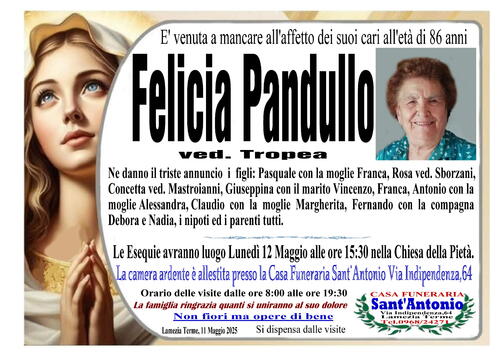 Ne danno il triste annuncio i figli: Pasquale con la moglie Franca, Rosa ved. Sborzani, Concetta ved. Mastroianni, Giuseppina con il marito Vincenzo, Franca, Antonio con la moglie Alessandra, Claudio con la moglie Margherita, Fernando con la compagna Debora e Nadia, i nipoti ed i parenti tutti.