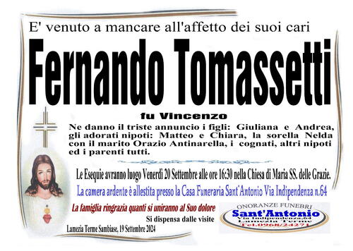 Ne danno il triste annuncio i figli: Giuliana e Andrea, gli adorati nipoti: Matteo e Chiara, la sorella Nelda con il marito Orazio Antinarella, i cognati, gli altri nipoti ed i parenti tutti.