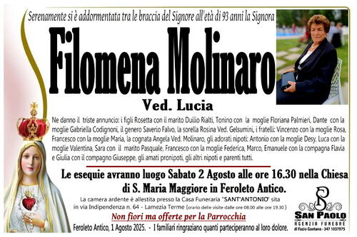 Feroleto Antico, 1 Agosto 2025. - I familiari ringraziano quanti parteciperanno al loro dolore.