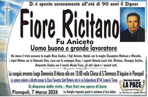 Le esequie avranno luogo Domenica 8 Marzo alle ore 15:00 nella Chiesa di S.Tommaso D’Aquino in Pianopoli.