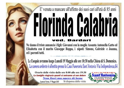 Ne danno il triste annuncio i figli: Giovanni con la moglie Assunta Antonella Gatto ed Elisabetta con il marito Giuseppe Roppa, i nipoti: Simone, Gabriele e Joanna, ed i parenti tutti.