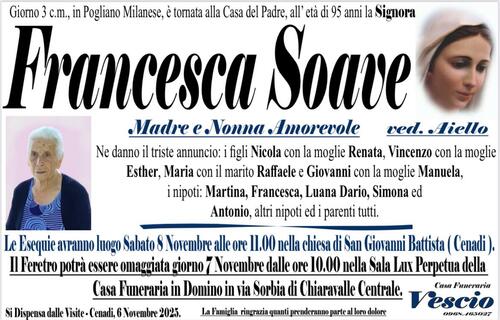 Le Esequie avranno luogo Sabato 8 Novembre alle ore 11.00 nella chiesa di San Giovanni Battista ( Cenadi ).