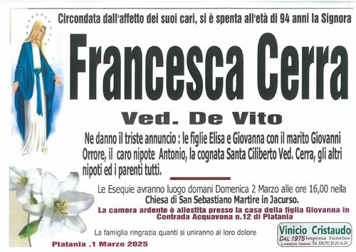 Ne danno il triste annuncio : le figlie Elisa e Giovanna con il marito Giovanni Orrore, il nipote Antonio, la cognata Santa Ciliberto Ved. Cerra gli altri nipoti ed i parenti tutti.
