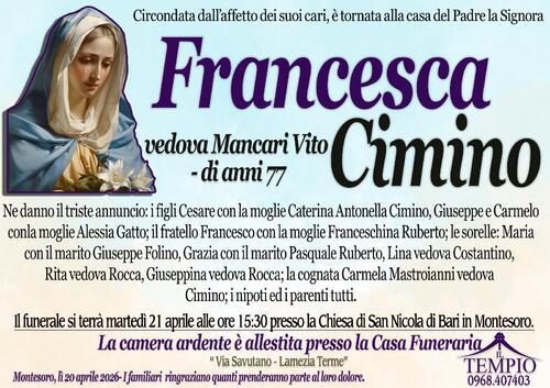 Il funerale si terrà martedì 21 aprile alle ore 15:30 presso la Chiesa di San Nicola di Bari in Montesoro.