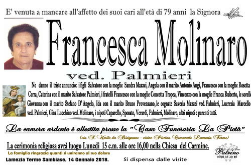 Ne danno il triste annuncio: i figli Salvatore con la moglie Sandra Mazzei, Angela con il marito Antonio Angì, Francesco con la moglie Rosetta Cerra, Caterina con il marito Salvatore Palmieri, i fratelli Francesco con la moglie Concetta Tropea, Vincenzo con la moglie Franca Ruberto, le sorelle Giovanna con il marito Stefano D' Angelo, Ida con il marito Bruno Provenzano, le cognate Saveria Mazzei ved. Palmieri, Lucrezia Marcello ved. Palmieri, Gina Lucchino ved. Molinaro, i nipoti Caparello, Sposato, Verardi, Palmieri, Molinaro, altri nipoti e parenti tutti.