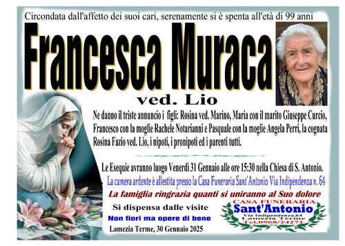 Ne danno il triste annuncio i figli: Rosina ved. Marino, Maria con il marito Giuseppe Curcio, Francesco con la moglie Rachele Notarianni e Pasquale con la moglie Angela Perri, la cognata Rosina Fazio ved. Lio, i nipoti, i pronipoti ed i parenti tutti.
