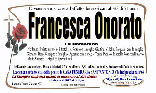 Ne danno il triste annuncio, i fratelli: Alfonso con la moglie Giustina Villella, Pasquale con la moglie Giovanna Raso, Giuseppe e famiglia e Agostino con la moglie Teresa Papaleo, la sorella Rosa con il marito Mario Stranges, i nipoti ed i parenti tutti.