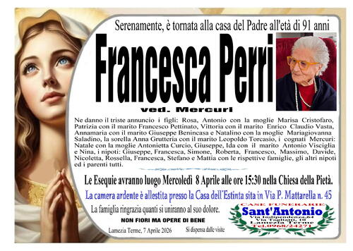 Ne danno il triste annuncio i figli: Rosa, Antonio con la moglie Maria Cristofaro, Patrizia con il marito Francesco Pettinato, Vittoria con il marito Enrico Claudio Vasta, Annamaria con il marito Giuseppe Benincasa e Natalino con la moglie Mariagiovanna Saladino, la sorella Anna Grutteria con il marito Leopoldo Torcasio, i cognati Mercuri: Natale con la moglie Antonietta Curcio, Giuseppe, Ida con il marito Antonio Visciglia e Nina, i nipoti: Giuseppe, Francesca, Simone, Roberta, Francesco, Massimo, Davide, Nicoletta, Rossella, Francesca, Stefano e Mattia con le rispettive famiglie, gli altri nipoti ed i parenti tutti.