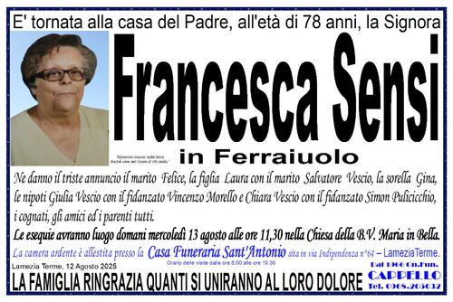 Le esequie avranno luogo domani mercoledì 13 agosto alle ore 11,30 nella Chiesa della B.V. Maria in Bella.