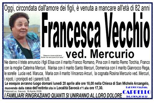 Le esequie avranno luogo domani lunedì 20 aprile alle ore 18,00 nella Chiesa di San Michele Arcangelo,