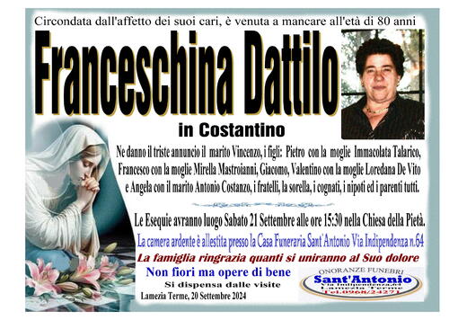 Ne danno il triste annuncio il marito Vincenzo, i figli: Pietro con la moglie Immacolata Talarico, Francesco con la moglie Mirella Mastroianni, Giacomo, Valentino con la moglie Loredana De Vito e Angela con il marito Antonio Costanzo, i fratelli, la sorella, i cognati, i nipoti ed i parenti tutti.