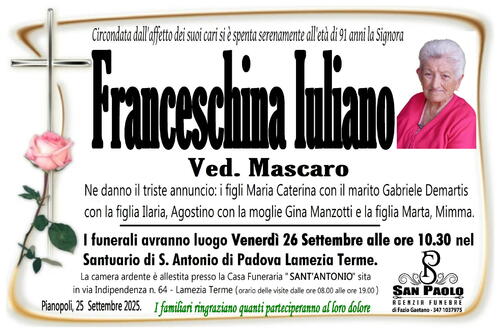 I funerali avranno luogo Venerdì 26 Settembre alle ore 10.30 nel