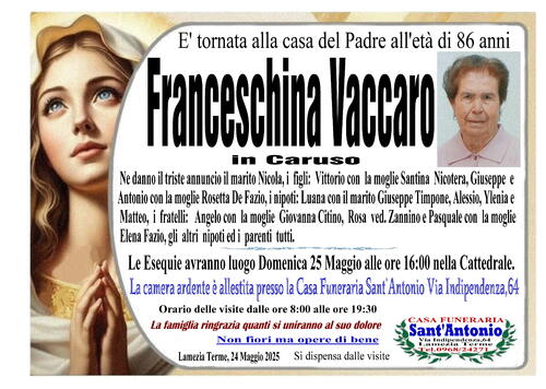 Ne danno il triste annuncio il marito Nicola, i figli: Vittorio con la moglie Santina Nicotera, Giuseppe e Antonio con la moglie Rosetta De Fazio, i nipoti: Luana con il marito Giuseppe Timpone, Alessio, Ylenia e Matteo, i fratelli: Angelo con la moglie Giovanna Citino, Rosa ved. Zannino e Pasquale con la moglie Elena Fazio, gli altri nipoti ed i parenti tutti.