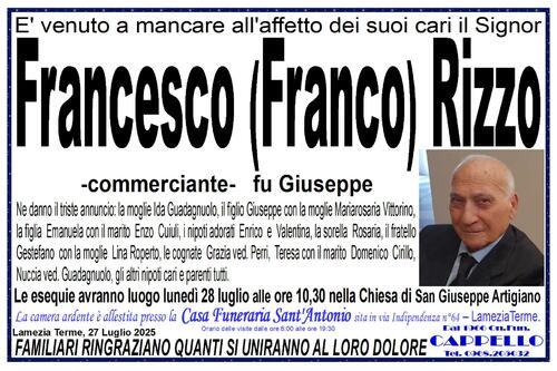 Le esequie avranno luogo lunedì 28 luglio alle ore 10,30 nella Chiesa di San Giuseppe Artigiano.