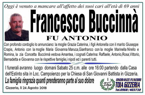 I funerali avranno luogo domani Sabato 25 c.m. alle ore 16:00 partendo dalla Casa