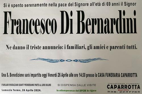 Una S. Benedizione sarà impartita oggi Venerdì 26 Aprile alle ore 14:30 presso la Casa Funeraria Caparrotta.