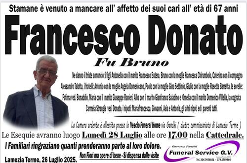 Le Esequie avranno luogo Lunedì 28 Luglio alle ore 17.00 nella Cattedrale.