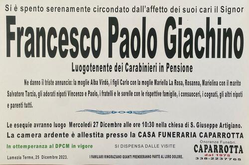 Ne danno il triste annuncio: la moglie Alba Virdò, i figli Carlo con la moglie Mariella La Rosa, Rosanna, Mariolina con il marito Salvatore Tarzia, gli adorati nipoti Vincenzo e Paolo, i fratelli e le sorelle con le rispettive famiglie, i consuoceri, i cognati, gli altri nipoti e parenti tutti.