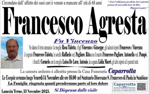 Le esequie avranno luogo Venerdì 14 Novembre alle ore 16:00 nel Santuario Diocesano S. Francesco di Paola in Sambiase.