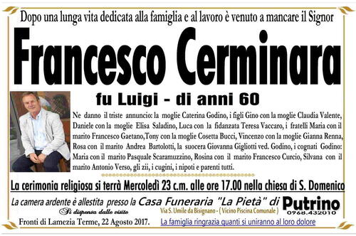 Ne danno il triste annuncio: la moglie Caterina Godino, i figli Gino con la moglie Claudia Valente,
