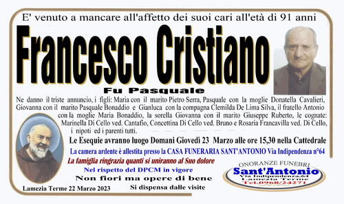 Ne danno il triste annuncio, i figli: Maria con il marito Pietro Serra, Pasquale con la moglie Donatella Cavalieri, Giovanna con il marito Pasquale Bonaddio e Gianluca con la compagna Clemilda De Lima Silva, il fratello Antonio con la moglie Maria Bonaddio, la sorella Giovanna con il marito Giuseppe Ruberto, le cognate: Marinella Di Cello ved. Cantafio, Concettina Di Cello ved. Bruno e Rosaria Francavilla ved. Di Cello, i nipoti ed i parenti tutti.