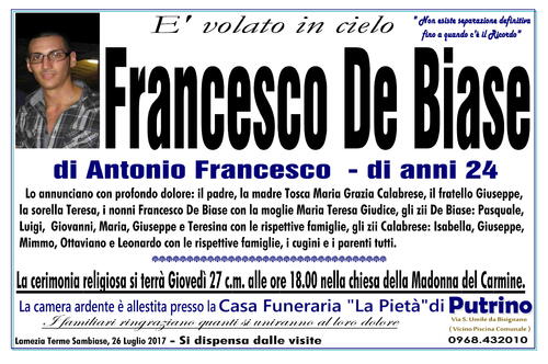 Lo annunciano con profondo dolore: il padre, la madre Tosca Maria Grazia Calabrese, il fratello Giuseppe,
