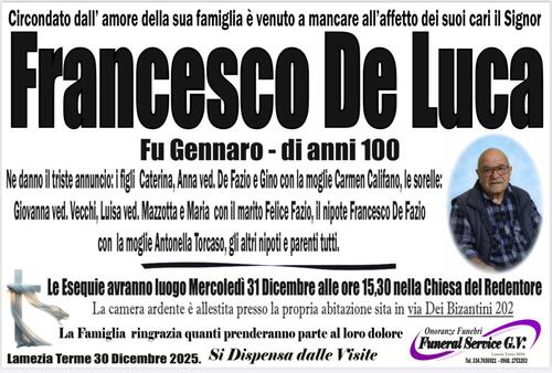 Le Esequie avranno luogo Mercoledì 31 Dicembre alle ore 15,30 nella Chiesa del Redentore