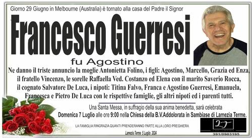 Ne danno il triste annuncio la moglie Antonietta Folino, i figli: Agostino, Marcello, Grazia ed Enza,