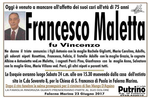 Le Esequie avranno luogo Sabato 24 c.m. alle ore 15.30 muovendo dalla casa dell'estinto