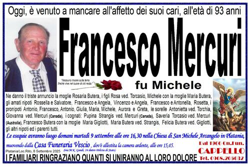 Le esequie avranno luogo domani martedì 9 settembre alle ore 16,30 nella Chiesa di San Michele Arcangelo in Platania,