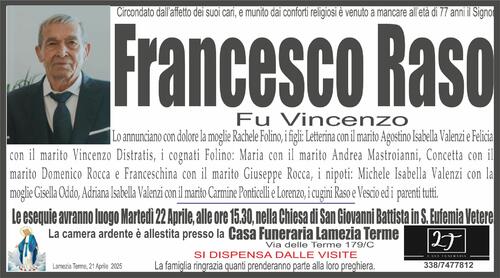 Lo annunciano con dolore la moglie Rachele Folino, i figli: Letterina con il marito Agostino Isabella Valenzi e Felicia