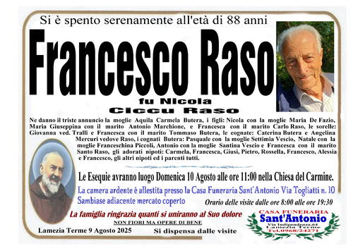 Ne danno il triste annuncio la moglie Aquila Carmela Butera, i figli: Nicola con la moglie Maria De Fazio, Maria Giuseppina con il marito Antonio Marchione e Francesca con il marito Carlo Raso, le sorelle: Giovanna ved. Tralli e Francesca con il marito Tommaso Butera, le cognate: Caterina Butera e Angelina Mercuri vedove Raso, i cognati Butera: Pasquale con la moglie Settimia Vescio, Natale con la moglie Franceschina Piccoli, Antonio con la moglie Santina Vescio e Francesca con il marito Santo Raso, gli adorati nipoti: Carmela, Francesca, Giusi, Pietro, Rossella, Francesco, Alessia e Francesco, gli altri nipoti e parenti tutti.