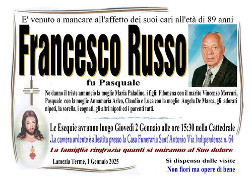 Ne danno il triste annuncio la moglie Maria Paladino, i figli: Filomena con il marito Vincenzo Mercuri, Pasquale con la moglie Annamaria Arleo, Claudio e Luca con la moglie Angela De Marca, gli adorati nipoti, la sorella, i cognati, gli altri nipoti ed i parenti tutti.