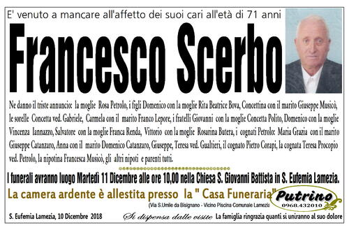 I funerali avranno luogo Martedì 11 Dicembre alle ore 10,00 nella Chiesa S. Giovanni Battista in S. Eufemia Lamezia.