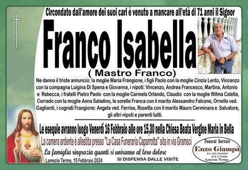 Le esequie avranno luogo Venerdì 16 Febbraio alle ore 15,30 nella Chiesa Beata Vergine Maria in Bella