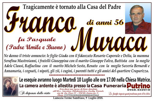 Le esequie avranno luogo Martedì 10 Luglio alle ore 17.00 nella Chiesa Matrice.