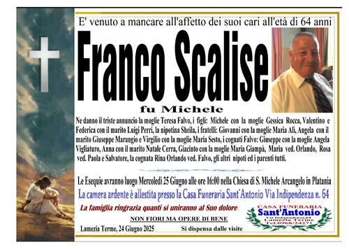 Ne danno il triste annuncio la moglie Teresa Falvo, i figli: Michele con la moglie Gessica Rocca, Valentino e Federica con il marito Luigi Perri, la nipotina Sheila, i fratelli. Giovanni con la moglie Maria Alì, Angela con il marito Giuseppe Marangio e Virgilio con la moglie Maria Sesto, i cognati Falvo: Giuseppe con la moglie Angela Vigliaturo, Anna con il marito Natale Cerra, Giacinto con la moglie Maria Giampà, Maria ved. Orlando, Rosa ved. Paola e Salvatore, la cognata Rina Orlando ved. Falvo, gli altri nipoti e parenti tutti.