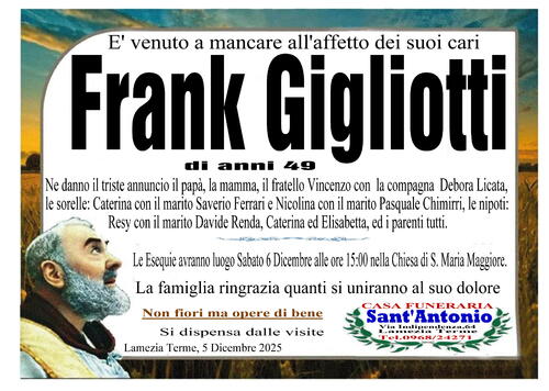 Ne danno il triste annuncio il papà, la mamma, il fratello Vincenzo con la compagna Debora Licata, le sorelle: Caterina con il marito Saverio Ferrari e Nicolina con il marito Pasquale Chimirri, le nipoti: Resy con il marito Davide Renda, Caterina ed Elisabetta, ed i parenti tutti.