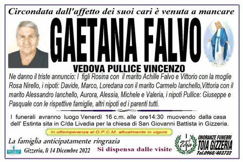 I funerali avranno luogo Venerdì 16 c.m. alle ore14:30 muovendo dalla casa